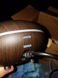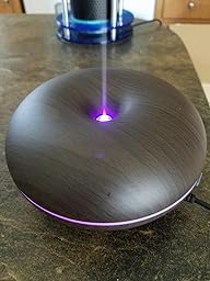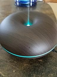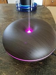 This little diffuser is very nice looking and works perfectly, it only holds 100 ml of water though and is very small. It will be used in our home for a bathroom and would work nicely in a small space. It has a pretty wood grain looking finish. This has an auto shutoff when the water gets low and that is the most important thing to me in a diffuser. I don't have to worry about the motor burning out when the water is gone. Set it and go!The diffuser is easy to use and has multiple settings for color lights and vapors. The feet are padded and wont scratch countertops. It works great and I've had no issues with it at all.