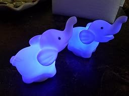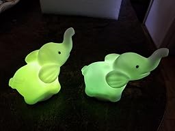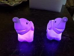 These little elephants are super cute, arrived quickly and in great shape, and are the perfect size for my 5 year old. We have quite a collection going of these little light up toys and these two do not disappoint. They start out red and then rotate through some really pretty colors. There is an easy on and off switch on the bottom. My little girl loves to light them up during bed time and once she is asleep we turn them off. They are not water proof.
